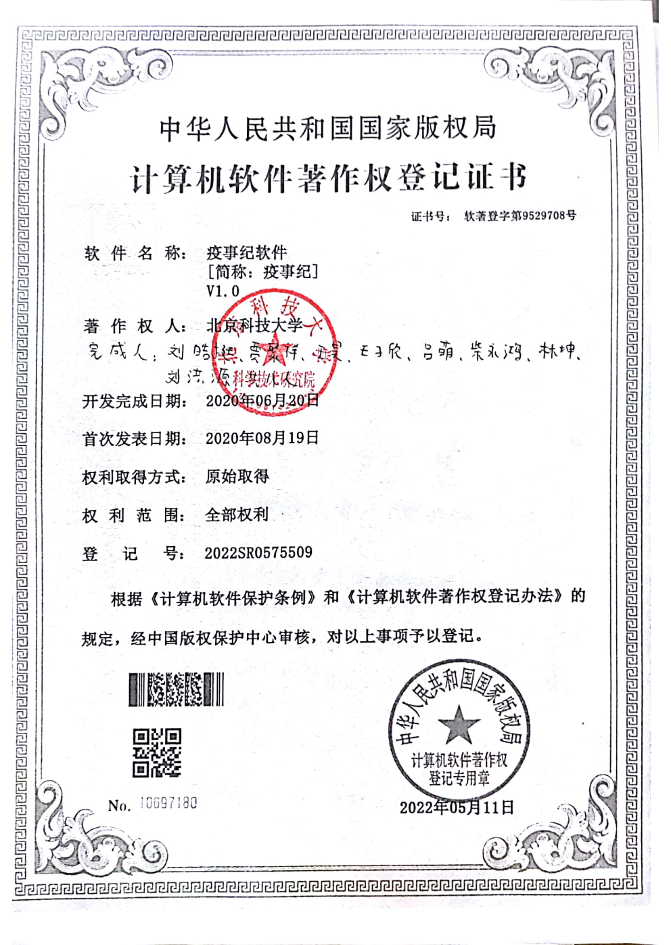 [1] 疫事纪软件[简称:疫事纪] V1.0,登记号:2022SR0575509,2022-05-11