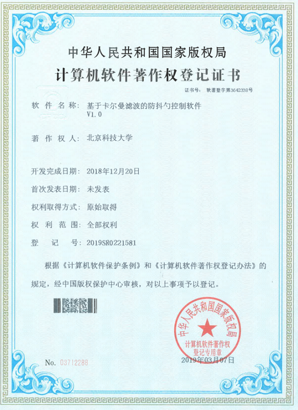 [10] 基于卡尔曼滤波的防抖勺控制软件V1.0,登记号:2019SR0221581,2019-03-07