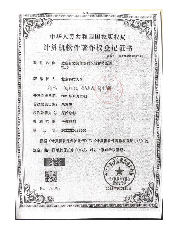 [2] 适应盲文阅读器的汉盲转换系统V1.0,登记号:2022SR0499500,2022-04-21