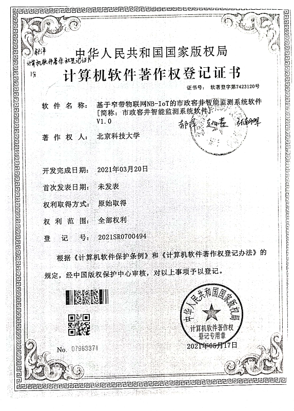 [8] 基于窄带物联网NB-IoT的市政窖井智能监测系统软件V1.0,登记号: 2021SR0700494,2021-05-17