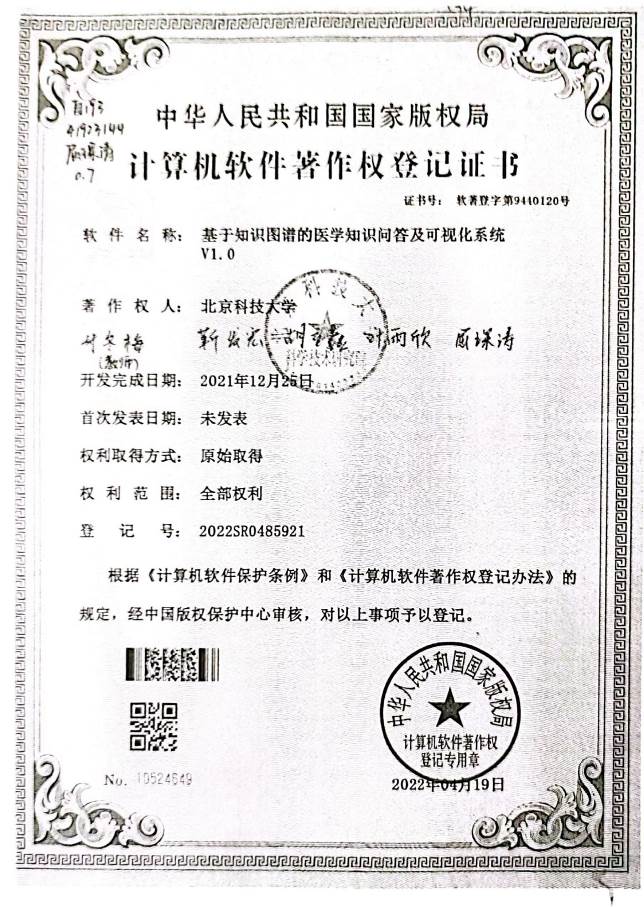 [3] 基于知识图谱的医学知识问答及可视化系统V1.0,登记号:2022SR0485921,2022-04-19