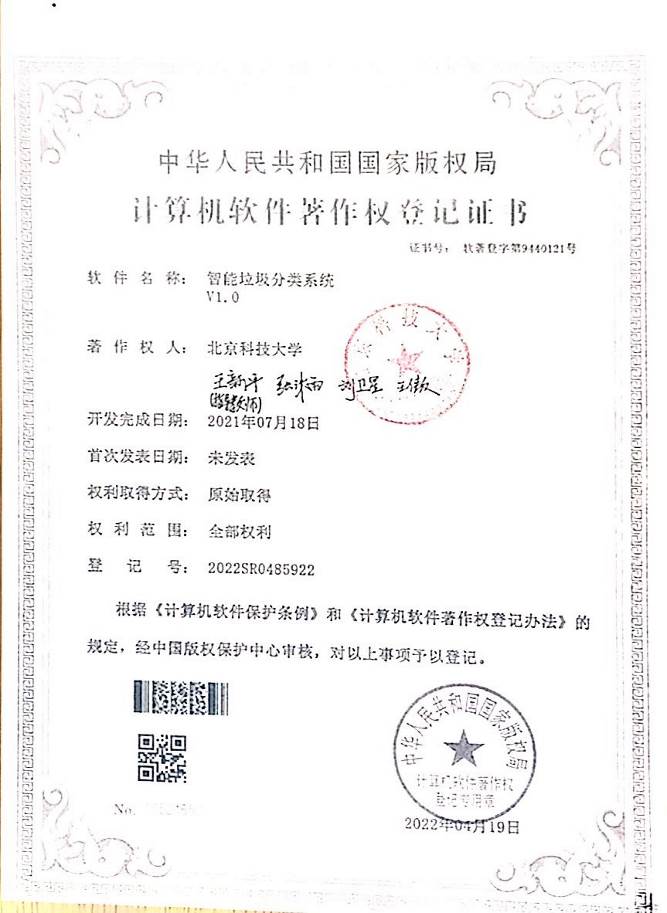 [4] 智能垃圾分类系统V1.0,登记号:2022SR0485922,2022-04-19