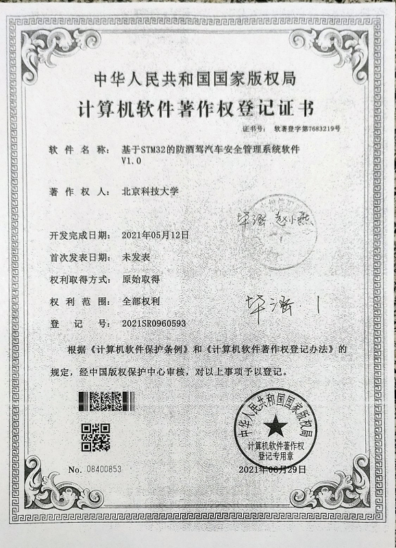 [5] 基于STM32的防酒驾汽车安全管理系统软件V1.0,登记号:2021SR0960593,2021-06-29