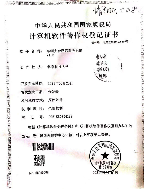 [6] 车辆安全网联服务系统V1.0,登记号:2021SR0804189,2021-06-01